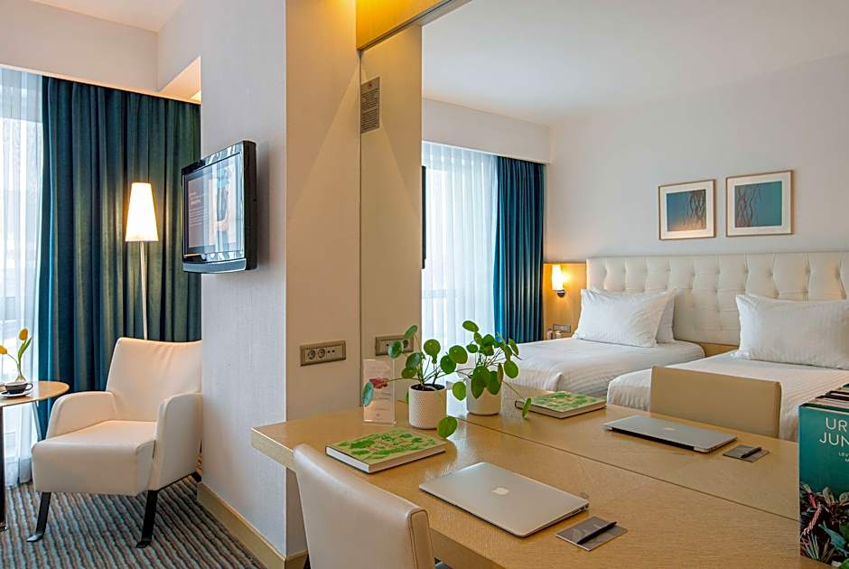 Standard smoking suite with one king bed. Additional Room features inlcude a living room, guest bathroom, bathroom with Jacuzzi and a separate rain shower. Room amenities include complimentary wireless and cable high-speed internet access, a 32 inch LCD TV, DVD, safe, minibar, kettle, scale, iron and ironing table, pillow menu, hairdryer, sound-proof heatresistant window system and TV and music facilities in the bathroom.
